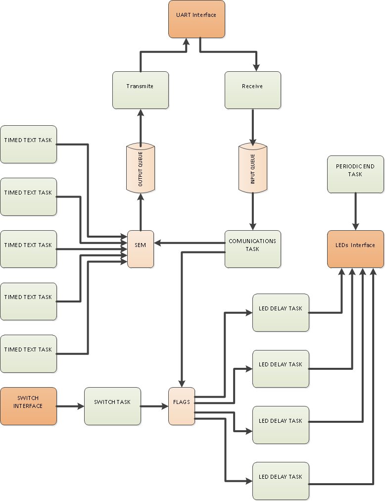 LED DELAY TASKS: Son un conjunto de tareas que esperan a que un flag en el objeto leds asociado a cada una de ellas se active. Entonces lo desactiva y enciende un LED asociado durante medio segundo. Estas tareas ejecutan un único segmento de código reentrante. Por ello se debe indicar el flag y el LED asociado cuando se crea cada una de estas tareas