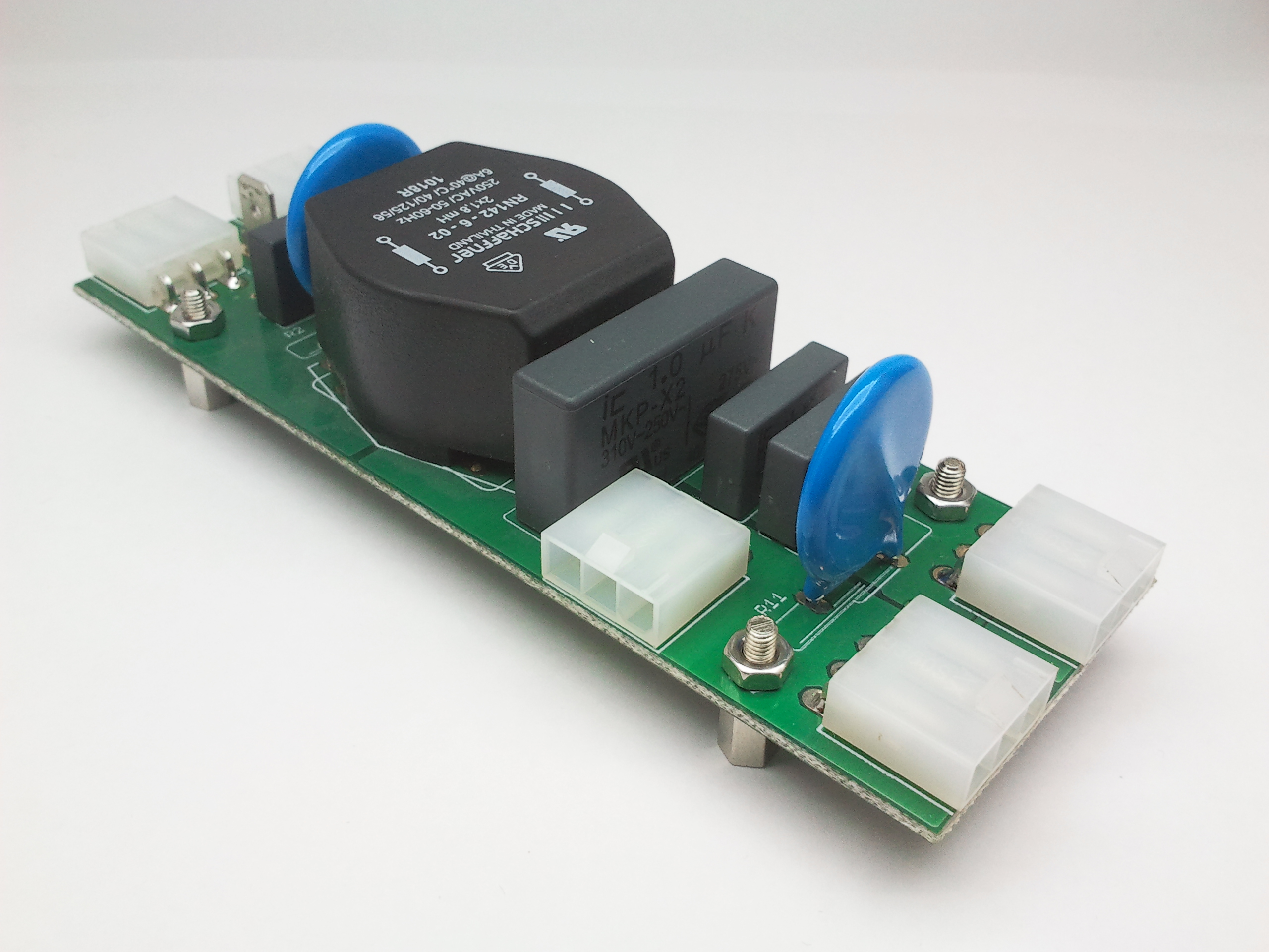 La tarjeta de distribución de corriente alterna cuenta con dos conectores de entrada para que se puedan conectar varias tarjetas en cascada. Dispone de tres conectores de salida para que puedan conectarse tres fuentes de alimentación. Y un conector de tipo fast-on para conectar la tierra al chasis.